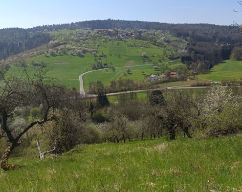 Nach einem Abstieg ins Schornbachtal und einem anschließenden Anstieg wird zur Mittagseinkehr der Hofladen Ziegler im Weiler Streich erreicht. Danach führt die Wanderung nach Schornbach hinab, um wieder mit Bus und S-Bahn Grunbach zu erreichen.