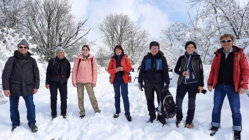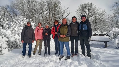 Das erste Etappenziel – das Hausener Eck auf 730 m – entlohnt mit einem herrlichen Blick nach Westen ins obere Filstal. Alle waren nun mit den Strapazen des Aufstiegs versöhnt und freuten sich auf das nächste Zwischenziel – den Burren. Vor diesem kahlen Berg hat man einen umwerfenden Blick zu den drei Kaiserbergen Hohenstaufen, Rechberg und Stuifen und ins nördliche Württemberg. Die Vesperpause fand aber nicht – wie den Teilnehmern zuvor vertraglich zugesichert – im Gras liegend und das Leben genießend, sondern stehend im tiefen Schnee statt.