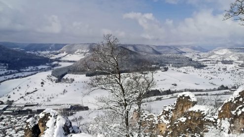 Pünktlich um 10 h dann Start in Hausen an der Fils, und gleich die Hausener Wand in Serpentinen hoch! Was wir zugegebenermaßen nicht auf dem Schirm hatten, das waren die 30 cm Schnee, die auf der Alb über Nacht gefallen waren. Wir Remstäler sind ja eher bürgerliche Temperaturen gewöhnt (zumal Anfang April), und Schnee kennen wir nur in homöopathischen Dosen. Aber was wir hier erleben durften, das war schon einmalig – aber auch sehr anstrengend zu erwandern. Der alte Amundsen hätte jedenfalls seine Freude an uns gehabt!