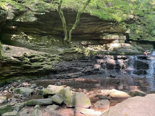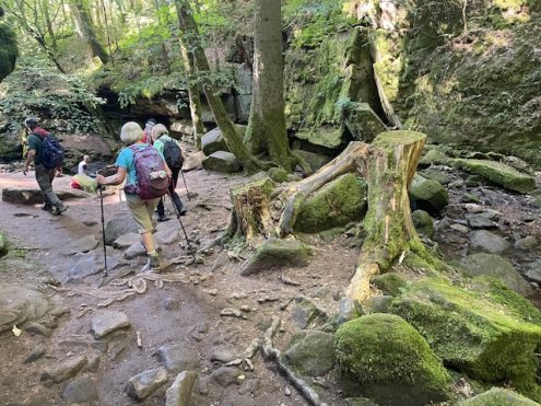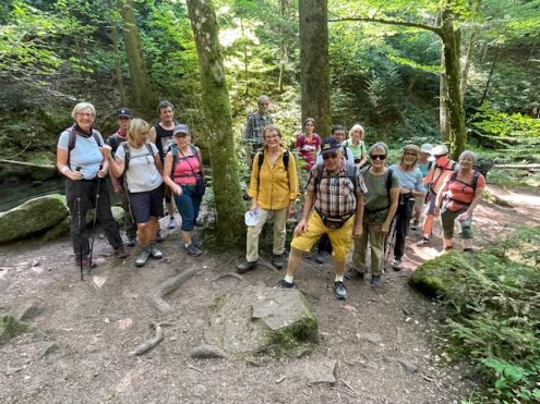 Nach dieser 30-minütigen, ebenso informativen wie kurzweiligen Führung und einem kleinen Streifzug durch das Kloster St. Peter und Paul wich die Kultur der Natur. Bergauf und bergab wanderten wir meist auf naturbelassenen Pfaden durch die imposante Wolfsschlucht hinauf zur Dachsbauhütte, unserem Rastplatz für das Mittagsvesper. Einige wanderten flott vorne weg, andere ließen es gemütlicher angehen und dazwischen wanderten noch „fünf Leut“. Die wanderten und wanderten und „oh je“: sie übersahen einen schmalen Abzweig und fehlten erst mal bei der Mittagsrast. Aber, das Malheur war dank Smartphone, Komoot und Telefonkontakt ganz schnell beseitigt. Die Fünf sind zwar ein paar Meter mehr gewandert, kamen aber wohlbehalten bei der Dachsbauhütte an und hatten noch genügend Zeit, um ihr wohl verdientes Vesper zu verzehren.
