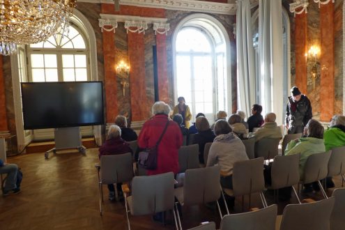 Großer Beifall für Frau Gerlinde Gebhart für ihre Ausführungen anlässlich einer nahezu zweistündigen Führung im Schloss Hohenheim. Mehr als 20 Teilnehmer waren beeindruckt von ihren Kenntnissen über Herzog Carl Eugen und vor allem, über den geschichtlichen Hintergrund im Zusammenhang mit dem Schloss. Vom Keller bis zu Räumen, die üblicherweise nicht zum Führungsprogramm gehören, lauschten Gäste und Mitglieder gespannt ihren Worten.