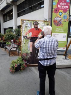 Am Rathaus war noch eine Photomontage mit einem Rennradler angebracht wo man sich mit seinem „Konterfein“ (Kopf) verewigen konnte. Einige ließen sich dies nicht entgehen.